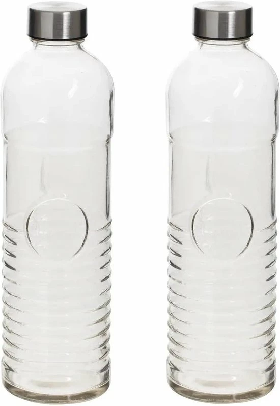Set van 2x stuks waterfles/drinkfles 1 liter van gehard ribbel glas. Met RVS schroefdeksel. Neemt geen geuren en smaken op. Afmeting: ca. D8 x H29 cm. Inhoud: ca. 1 liter/1000 ml. Gewicht: ca. 640 gram. Materiaal: glas.
