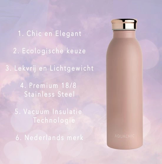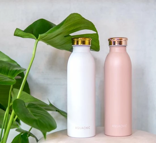 ‘’The Sustainable Chic Way’’. Verbeter het milieu met jouw Aquachic drinkfles. Hergebruik je fles om dagelijks plastic afval te verminderen. De Aquachic thermosflessen zijn 100% recyclebaar en duurzaam, de beste keuze voor onze planeet.