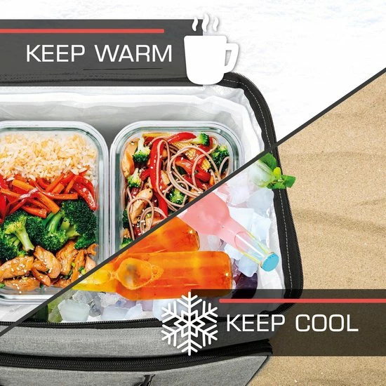 De koelbox heeft een volume van ca. 52 liter en afmetingen van ca. 53x37x32 cm. In de koeltas zittten een afneembare, waterdichte folie en een stabiliserende bodemplaat, zelfs ijskoud water kan op deze manier worden opgeborgen. Een verstelbare, gewatteerde schouderband en twee zijhandvatten maken het transport comfortabel en gemakkelijk. De bijzonderheid? De tas kan zowel gebruikt worden om warm te houden als om het koud te houden.