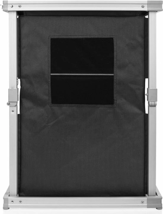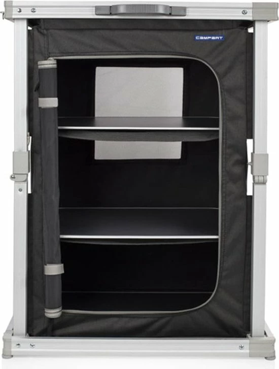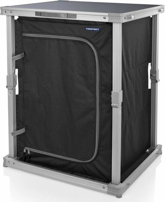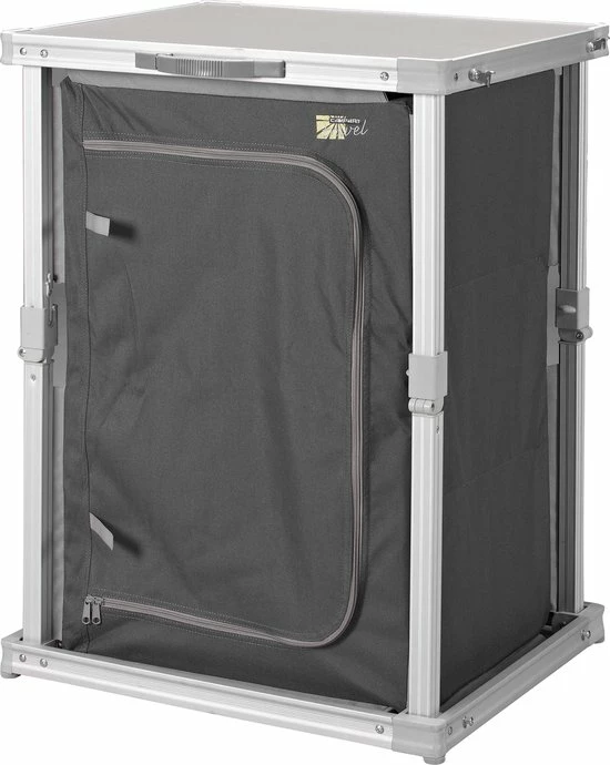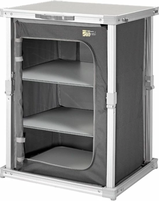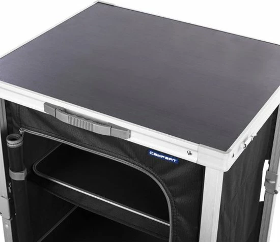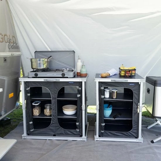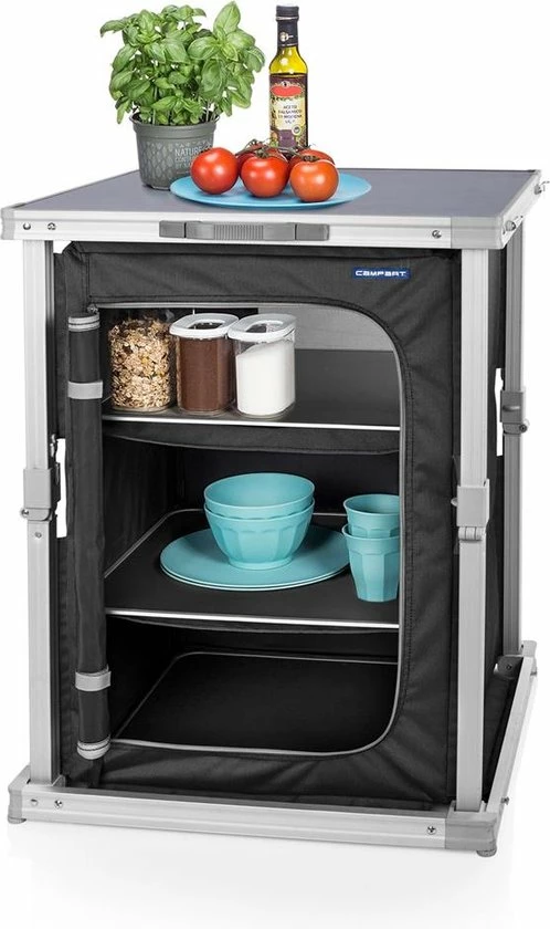 De campingkast is voorzien van drie vakken, waardoor er veel opbergruimte is. De stof is gemaakt van 600D polyester en is dus erg sterk. De kast heeft goede ventilatie door het gaas aan de achterkant van de kast. Met de vier verstelbare poten kun je hem aanpassen voor extra stabiliteit. Daarnaast is de Campart Travel campingkast voorzien van een inventief vouwsysteem om hem in een handomdraai op te vouwen tot een aktetas. Ook het tafelblad van de kast is erg makkelijk schoon te maken.