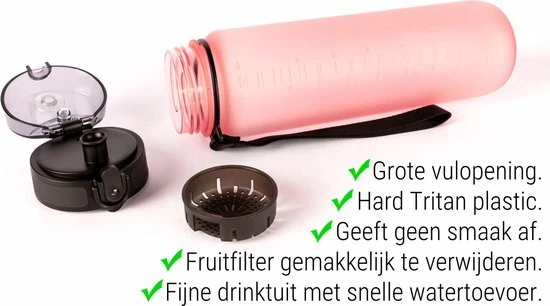 Er zit een infuser filter in de flessen zodat je er ook allerlei soorten fruit in kan doen en niet verstopt gaat zitten. Met dit fruitfilter krijg je een lekker fruit smaakje aan je water. Zeer goede drinkfles met infuser filter is ook te gebruiken om thee blaadjes in het water te doen, maar ook bijvoorbeeld handig om ijsblokjes in te doen zodat je lekker fris water hebt tijdens het sporten of outdoor activiteiten. Het filter is er ook gemakkelijk uit te halen.
