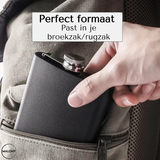 Dankzij de holle vormgeving zit de fles extra comfortabel in je broekzak. Dit maakt de heupfles zeer geschikt om mee te nemen op reis of onderweg. Het volume van de Malony® heupfles is 180 ml (6oz), dit is genoeg om jouw favoriete drankje mee te kunnen nemen en te delen met je vrienden.