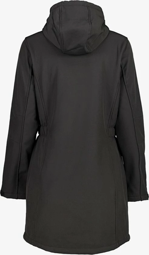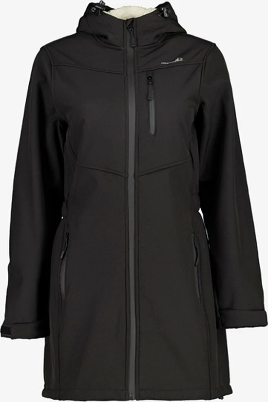 Lange, zwarte softshell jas voor dames uit de Mountain Peak outdoorcollectie. De dames jas is voorzien van een vaste capuchon, waterdichte ritsen en twee zakken die af te sluiten zijn met een rits. Daarnaast heeft de softshell jas nog een extra borstzakje met ritssluiting. Het materiaal is winddicht, ademend en warmte regulerend. De softshell jas van Mountain Peak heeft een waterkolom van 3000 MM. Gemaakt van 95% polyester en 5% elastaan