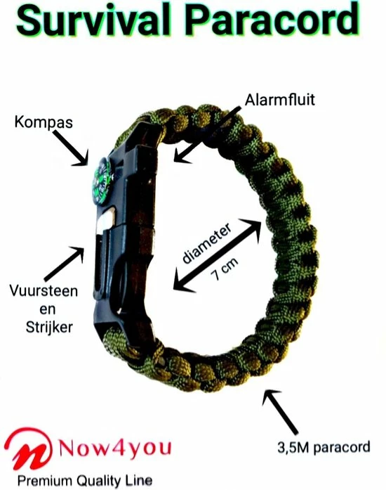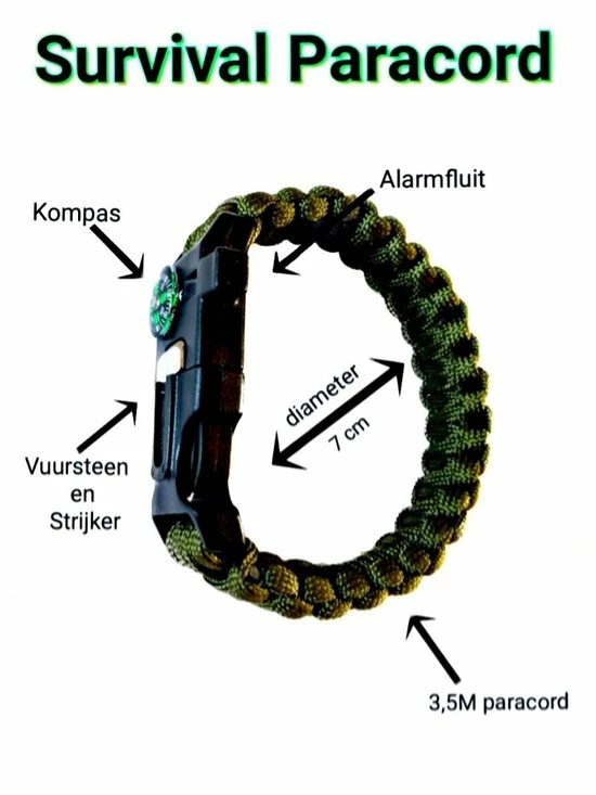 De armband is van gevlochten nylon koord, dat ook wordt gebruikt voor parachutes. Dit materiaal is zeer licht qua gewicht, maar zeer sterk en duurzaam.