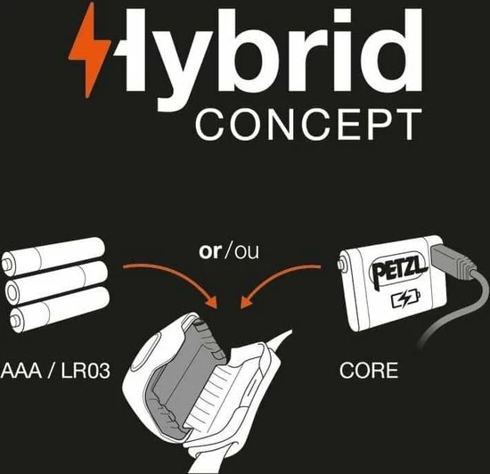 •TACTIKKA CORE is een HYBRID-koplamp: deze wordt geleverd met de CORE-oplaadbare batterij en is ook compatibel met drie AAA / LR03-batterijen