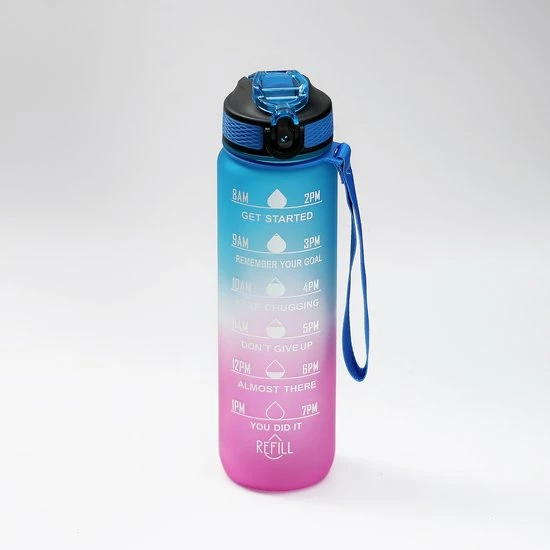 - Drinkfles met tijdmarkeringen: de vochttoevoer is een eenvoudige truc die je helpt om gezond te blijven. Deze waterfles met een inspirerend citaat en tijdstempel herinnert je er altijd aan om de juiste hoeveelheid water te consumeren, om de hele dag door gehydrateerd te blijven.