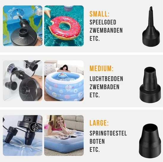 ▶ 3 Verschillende maten: De pomp komt met 3 verschillende maten opblaaskopjes. Elk kopje heeft een andere maat. Zo bezit je over verschillende groottes en ben je instaat nagenoeg elk opblaasbaar object op te blazen.